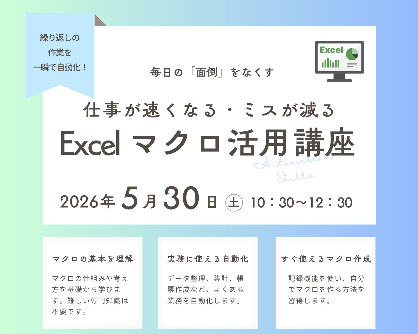 仕事が速くなる・ミスが減るExcelマクロ活用講座(5/30)5月30日(土)2,000円10:30~12:30アルネ・津山4階 地域交流センター