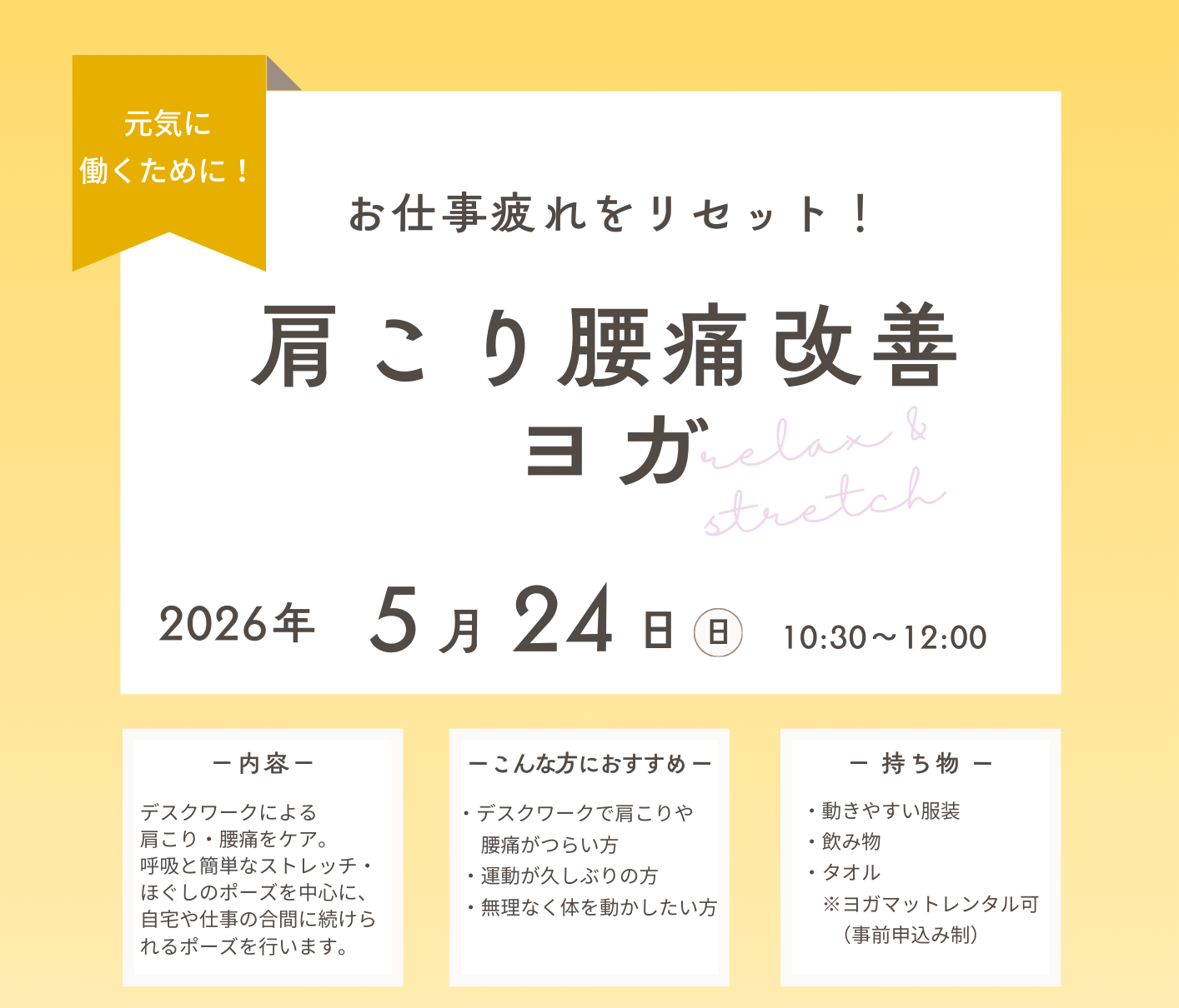 お仕事疲れをリセット!肩こり腰痛改善 ヨガ(5/24)5月24日(日)1,000円10:30~12:00アルネ・津山4階 地域交流センター