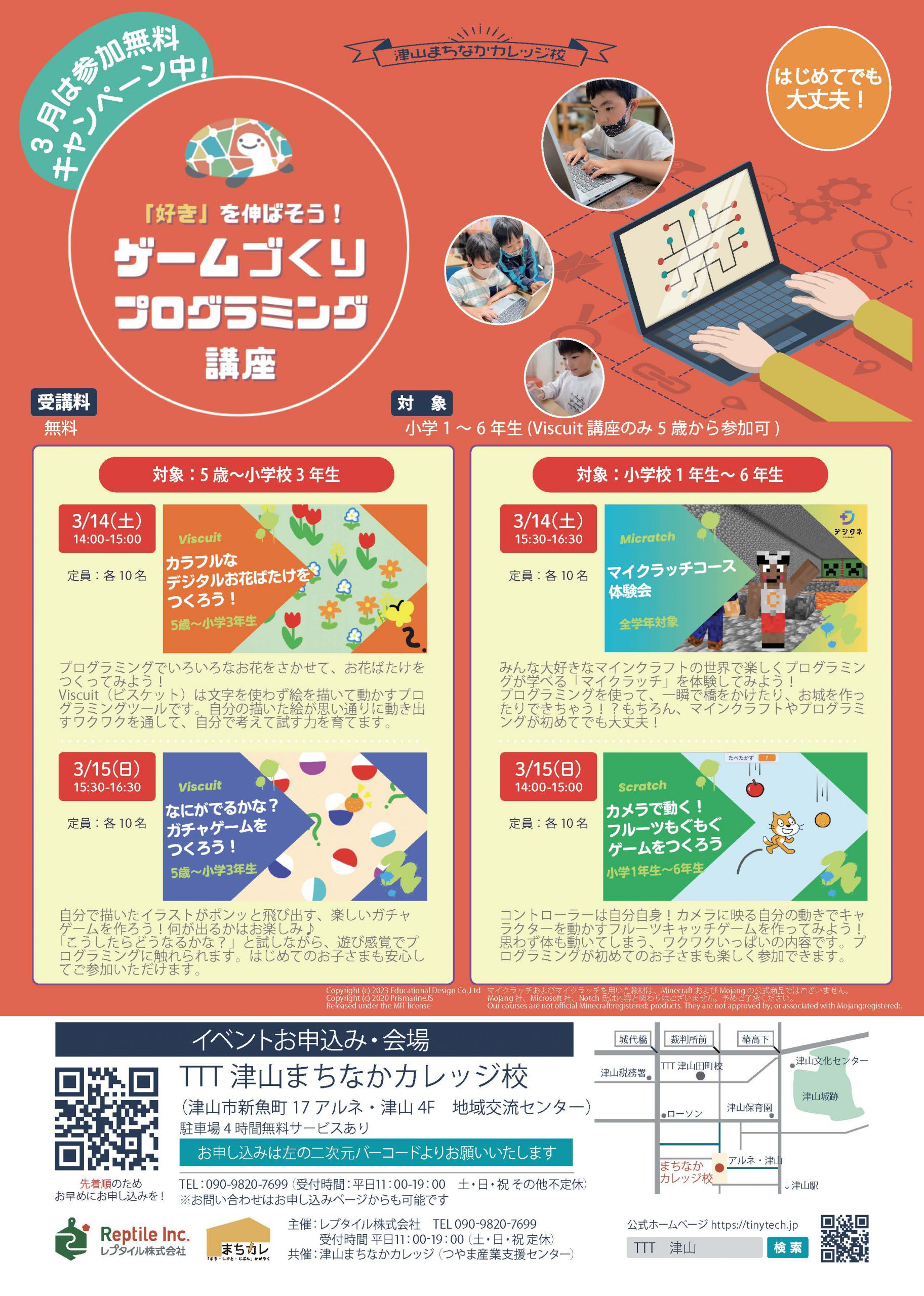 「たのしい!」を自分の手でつくる!【参加無料】ゲームづくりプログラミング講座(3/15)3月15日(日)無料14:00~15:00アルネ・津山4階 地域交流センター -