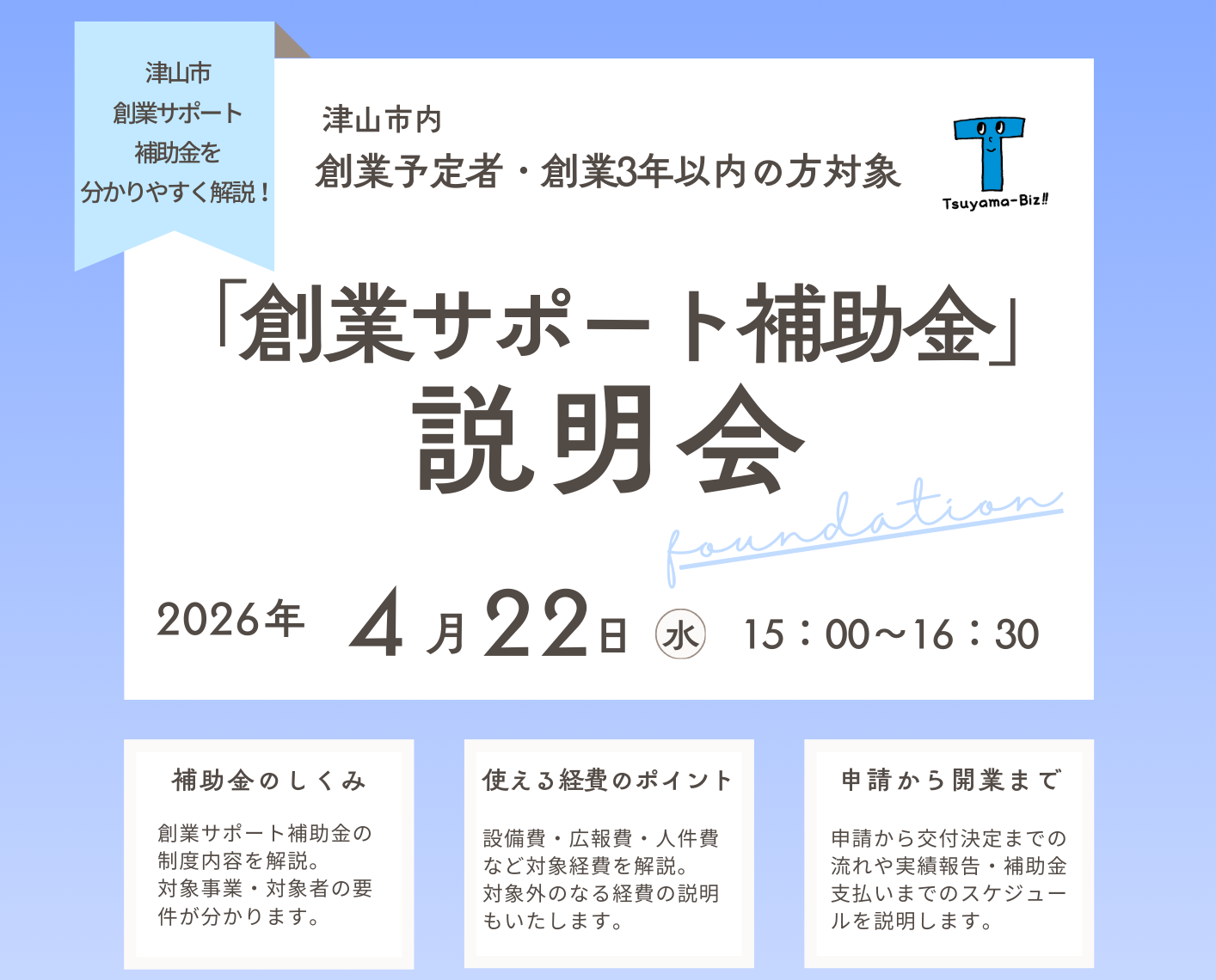 地域のチャレンジを応援! 知っておきたい支援制度を一度に確認創業サポート補助金説明会(4/22)4月22日(水)無料15:00~16:30津山市役所東庁舎1階 E101 -