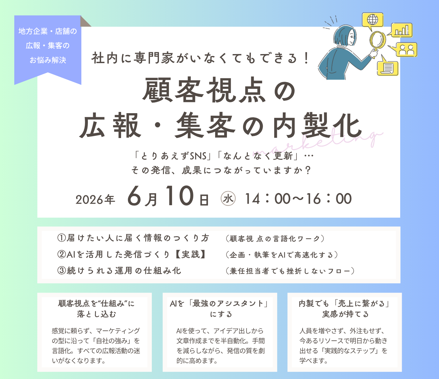 社内に専門家がいなくてもできる!顧客視点の 広報・集客の内製化(6/10)6月10日(水)2,000円14:00~16:00アルネ・津山4階 地域交流センター -