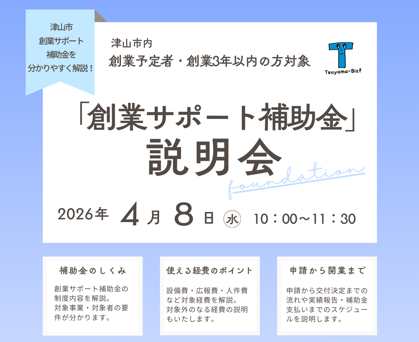 地域のチャレンジを応援! 知っておきたい支援制度を一度に確認創業サポート補助金説明会(4/8)4月8日(水)無料10:00~11:30津山市役所東庁舎1階 E101 -