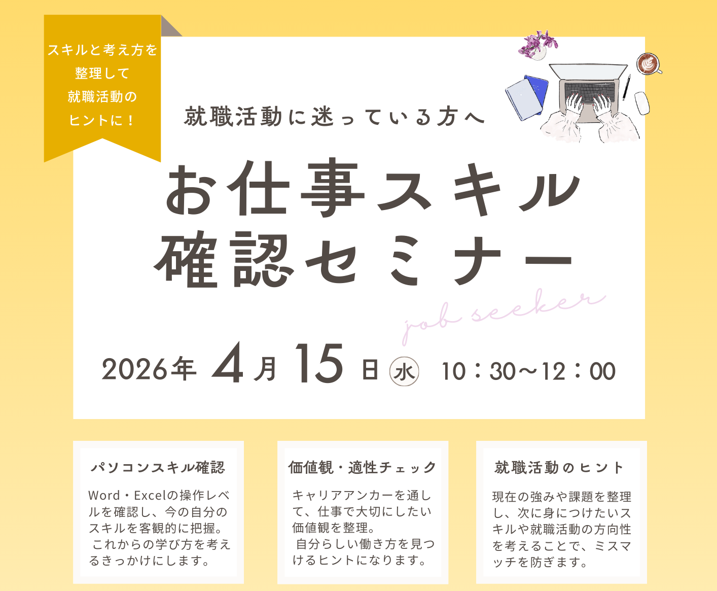 お仕事を探されている方お仕事スキル確認セミナー(4/15)4月15日(水)無料10:30~12:00アルネ・津山4階 地域交流センター -
