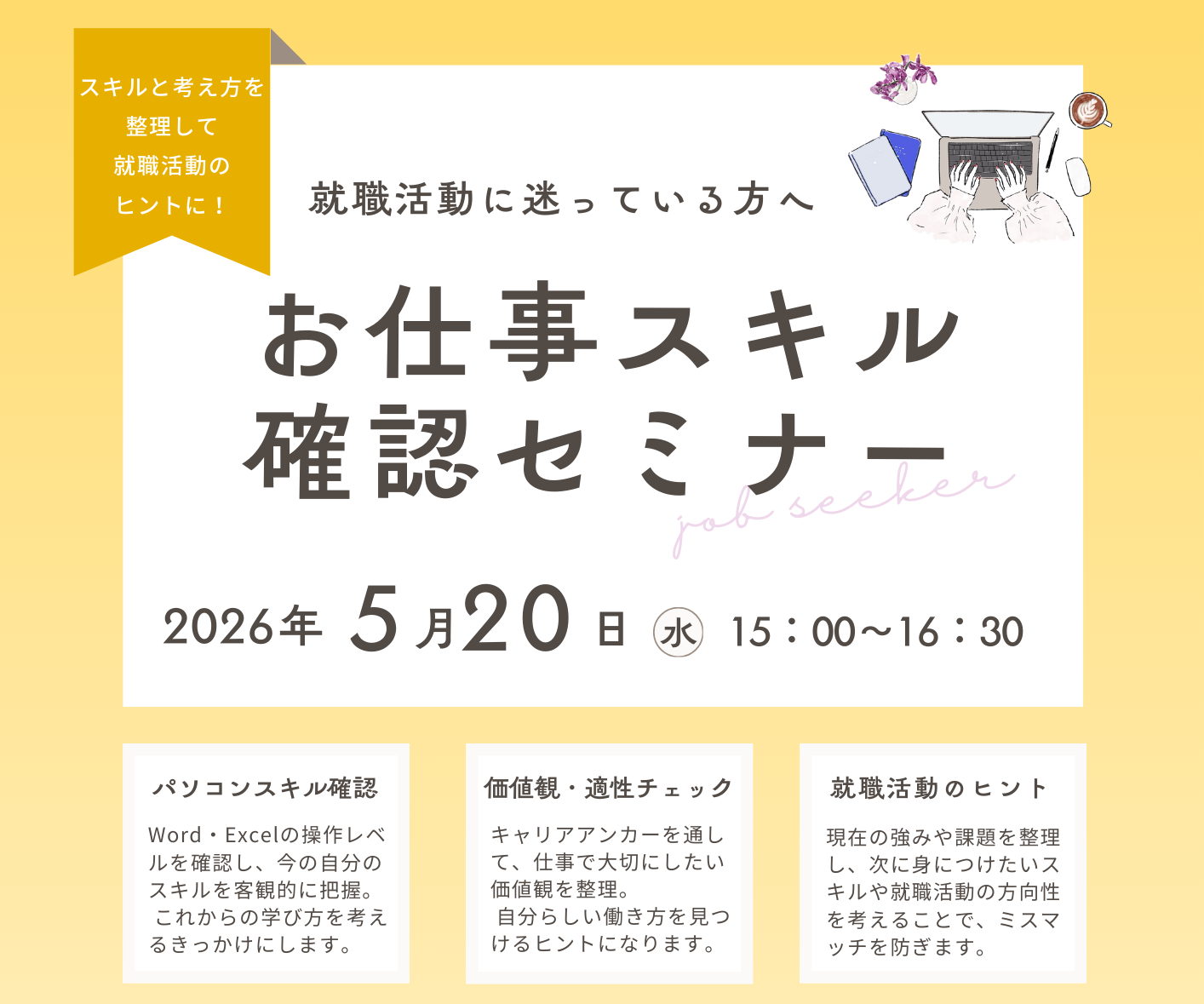 お仕事を探されている方お仕事スキル確認セミナー(5/20)5月20日(水)無料14:30~16:00アルネ・津山4階 地域交流センター -