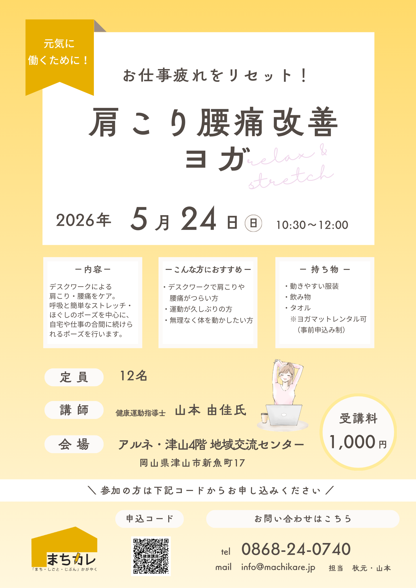 呼吸と簡単なストレッチ・ほぐしのポーズを中心に、自宅や仕事の合間に続けられるポーズを行います。