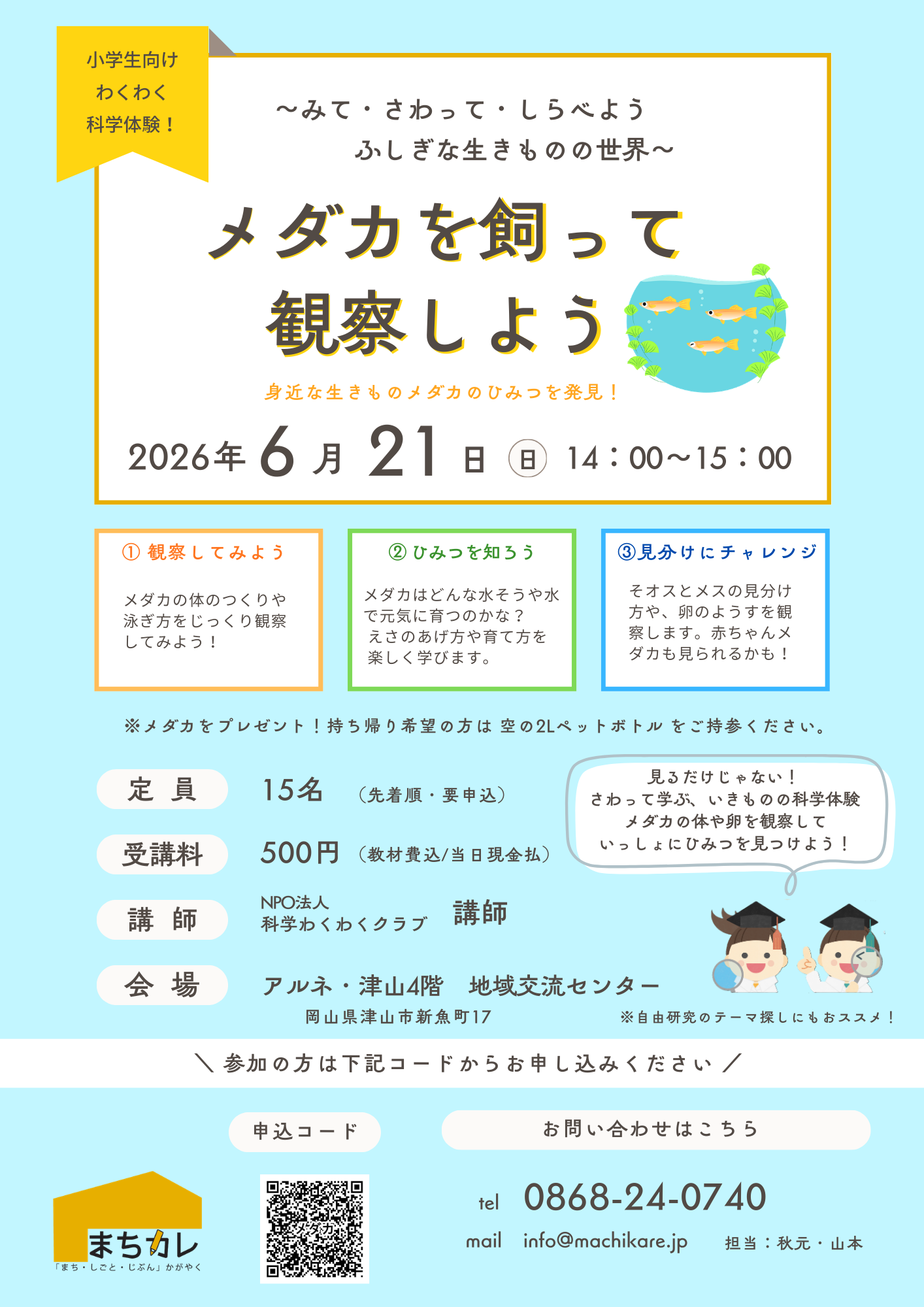 身近な生きもの「メダカ」をテーマに、観察や体験を通して楽しく学ぶ科学講座です。