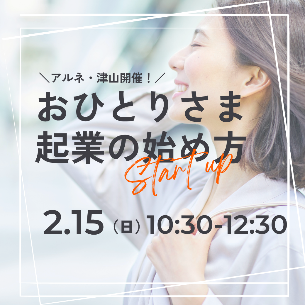 あなたの強みを活かして、理想の働き方を手に入れませんか?女性向け「おひとりさま起業のはじめ方」(2/15)2月15日(日)1,000円10:30~12:30アルネ・津山4階 地域交流センター -